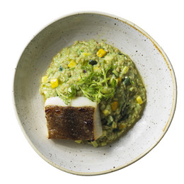 香煎比目鱼配菠菜青汁烩糙米饭